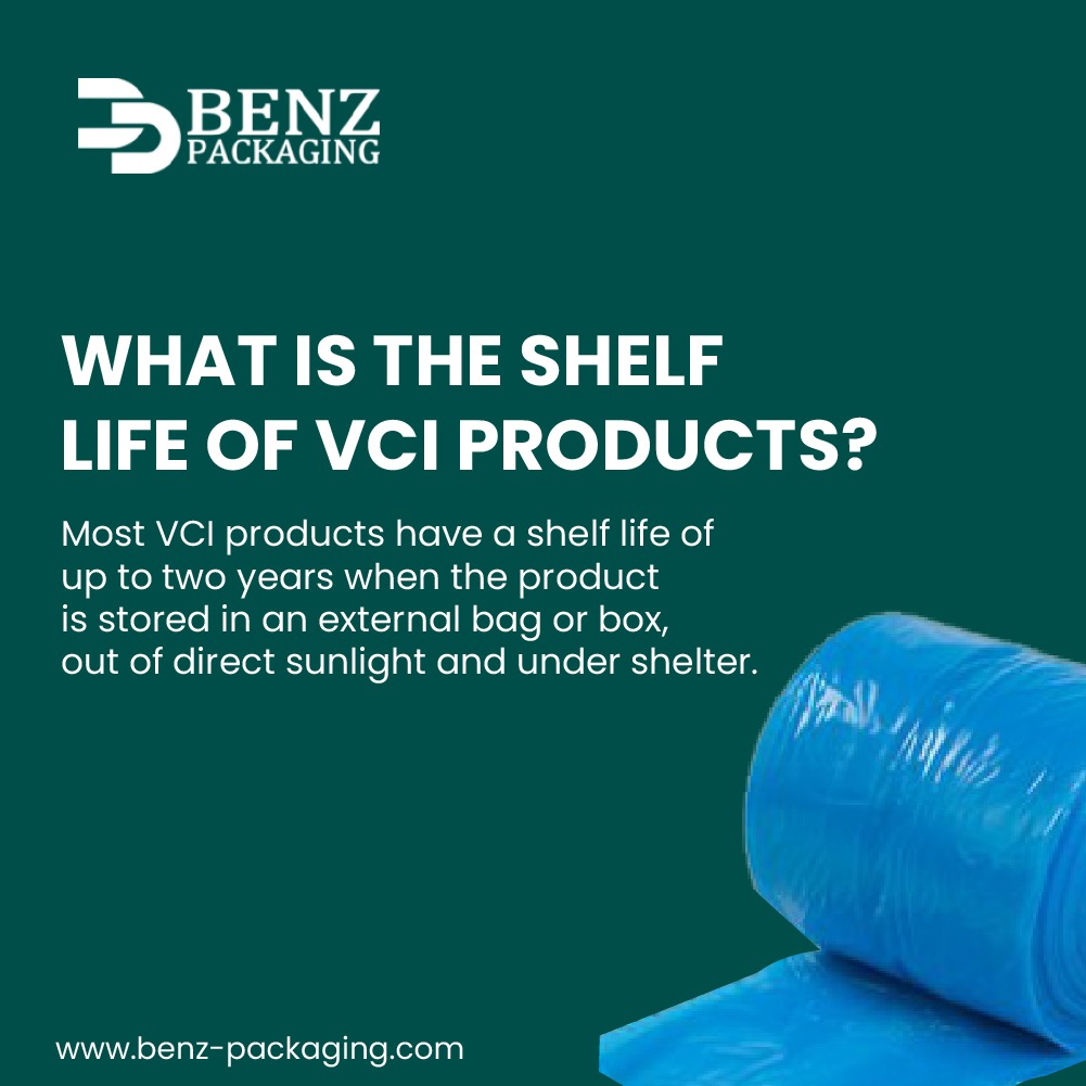 Most BENZ Packaging VCI film products have a shelf life of up to two years when the product is stored in original airtight packaging, out of direct sunlight, and under shelter. Other products such as VCI paper, VCI emitters, liquids, and rust removers may have a shorter shelf life