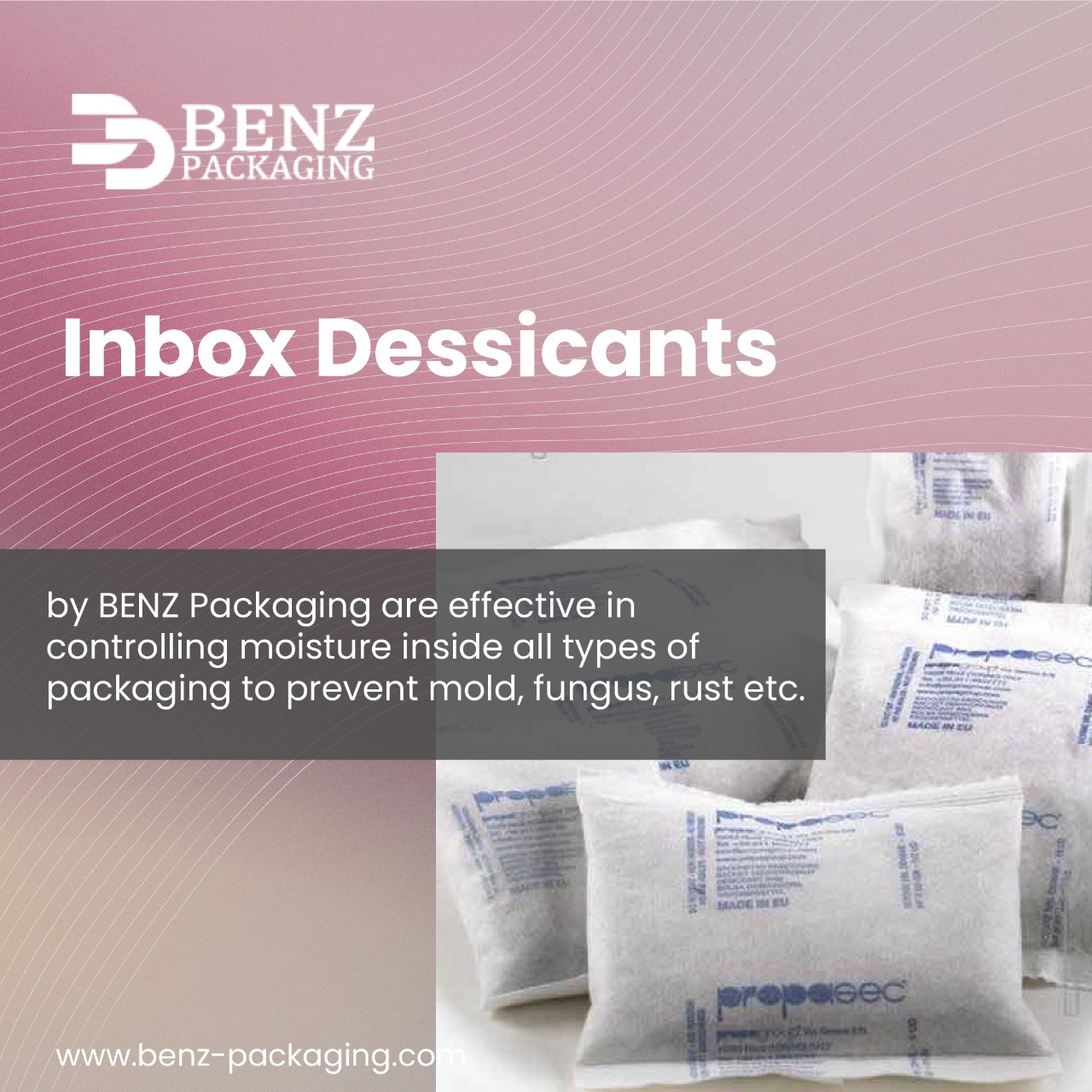 PROPASEC Desiccant bags by BENZ Packaging represent the most successful and safe solution to reduce the humidity level inside your Packaging. Thanks to its Absorption Capacity, PROPASEC reduces the dew point inside the package allowing it to protect the product qualities and properties against humidity attacks.